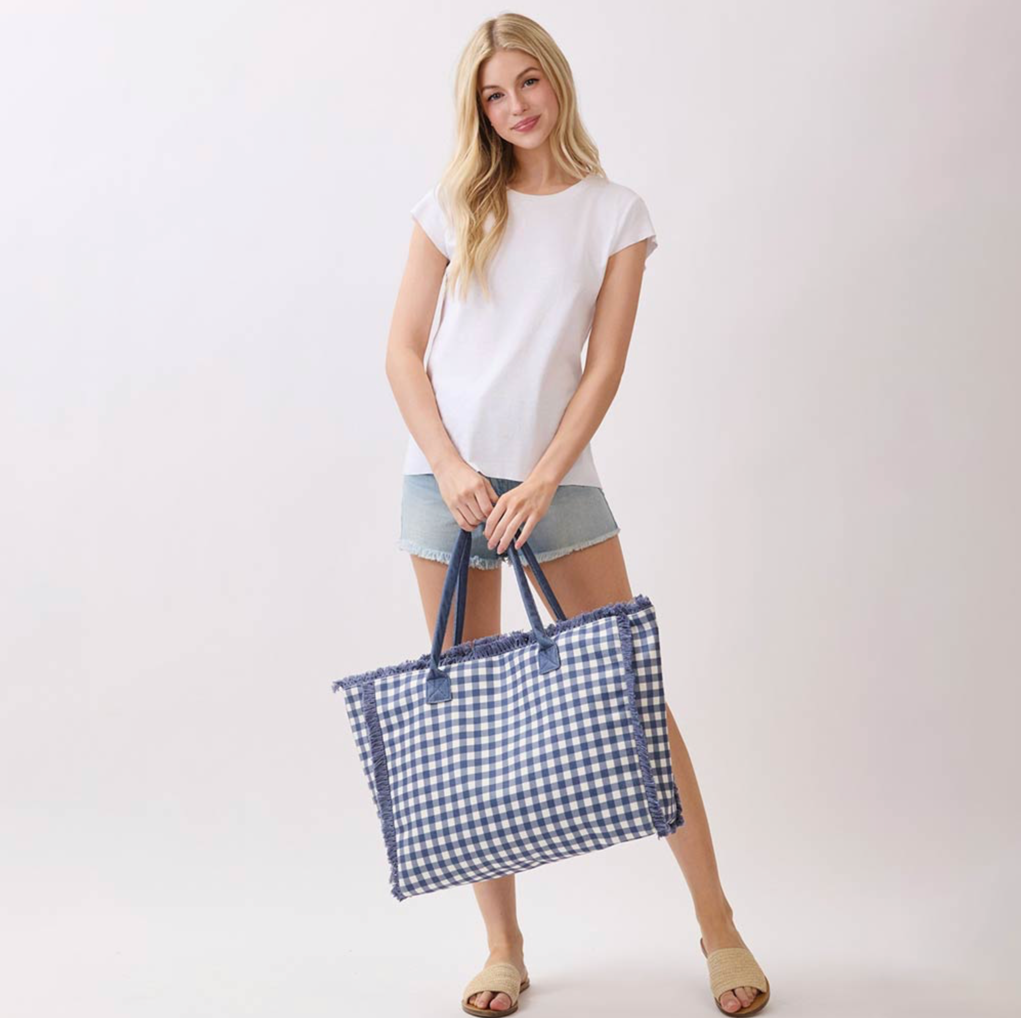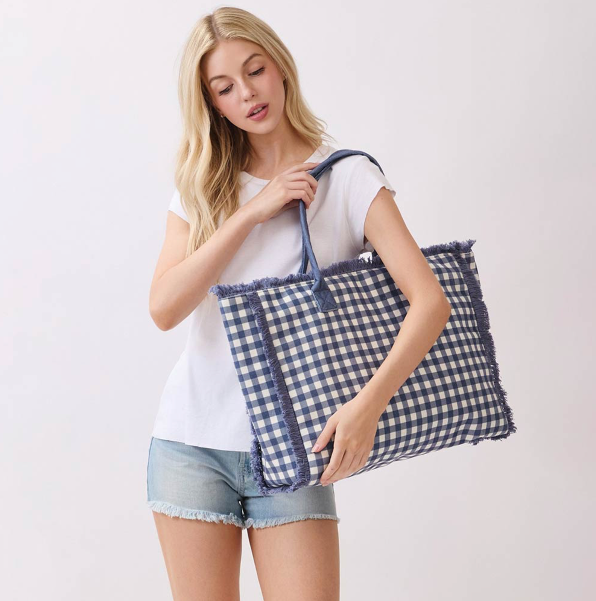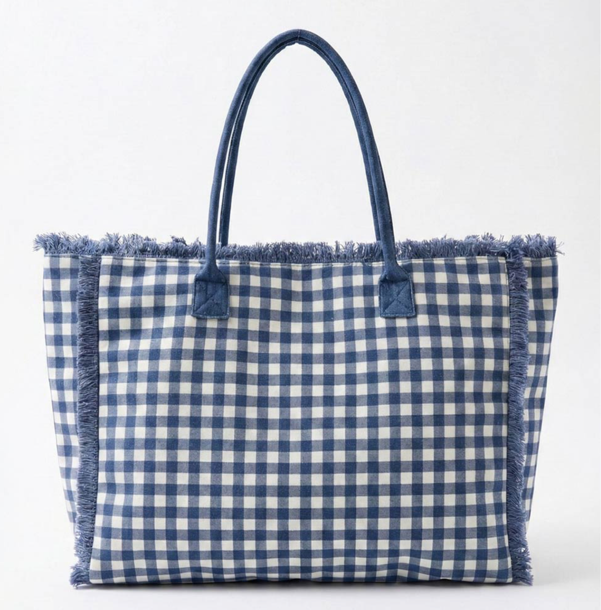 • Oversized tote bag featuring classic gingham pattern styling with bold fringe trim accents and comfortable shoulder straps. Designed with a spacious interior for beach days, travel, shopping, and everyday carry. A playful statement piece for seasonal boutique collections.