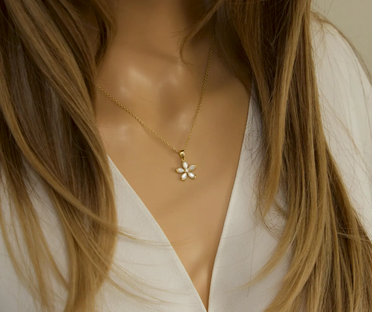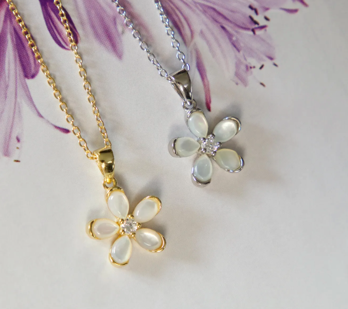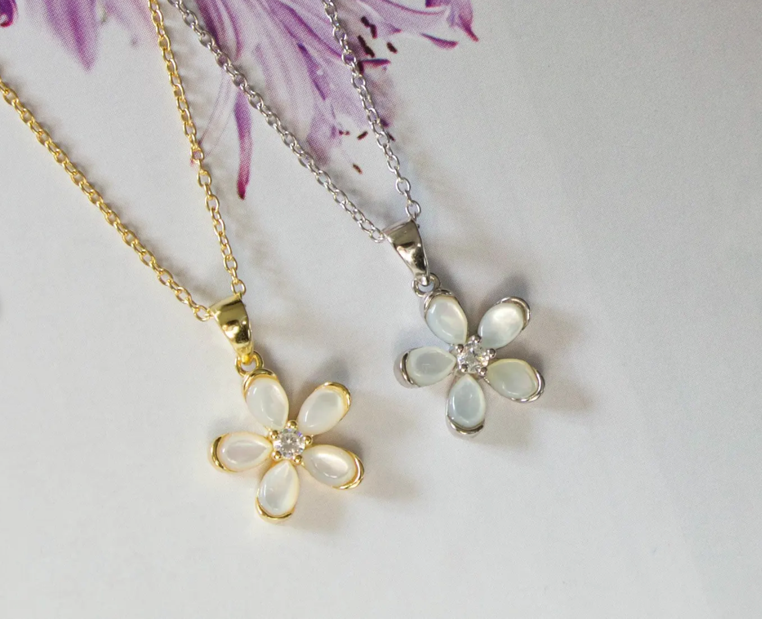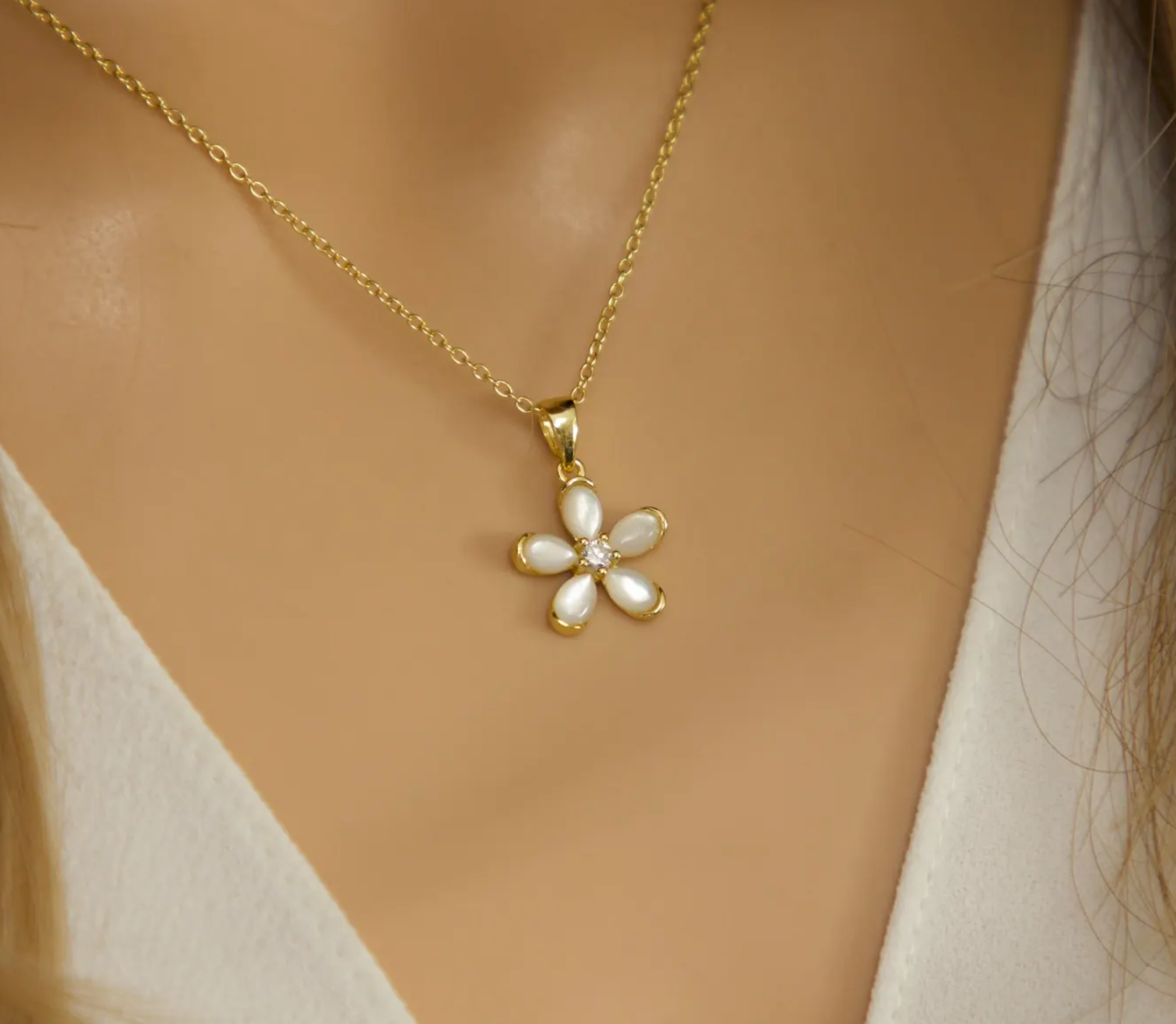 Bring soft elegance to your everyday look with this Mother of Pearl Flower Necklace, available in gold vermeil or solid sterling silver 925. Each petal is crafted from luminous natural mother of pearl, centered with a sparkling CZ cluster for a delicate, feminine finish—perfect for gifting during the holidays or elevating your everyday style.
