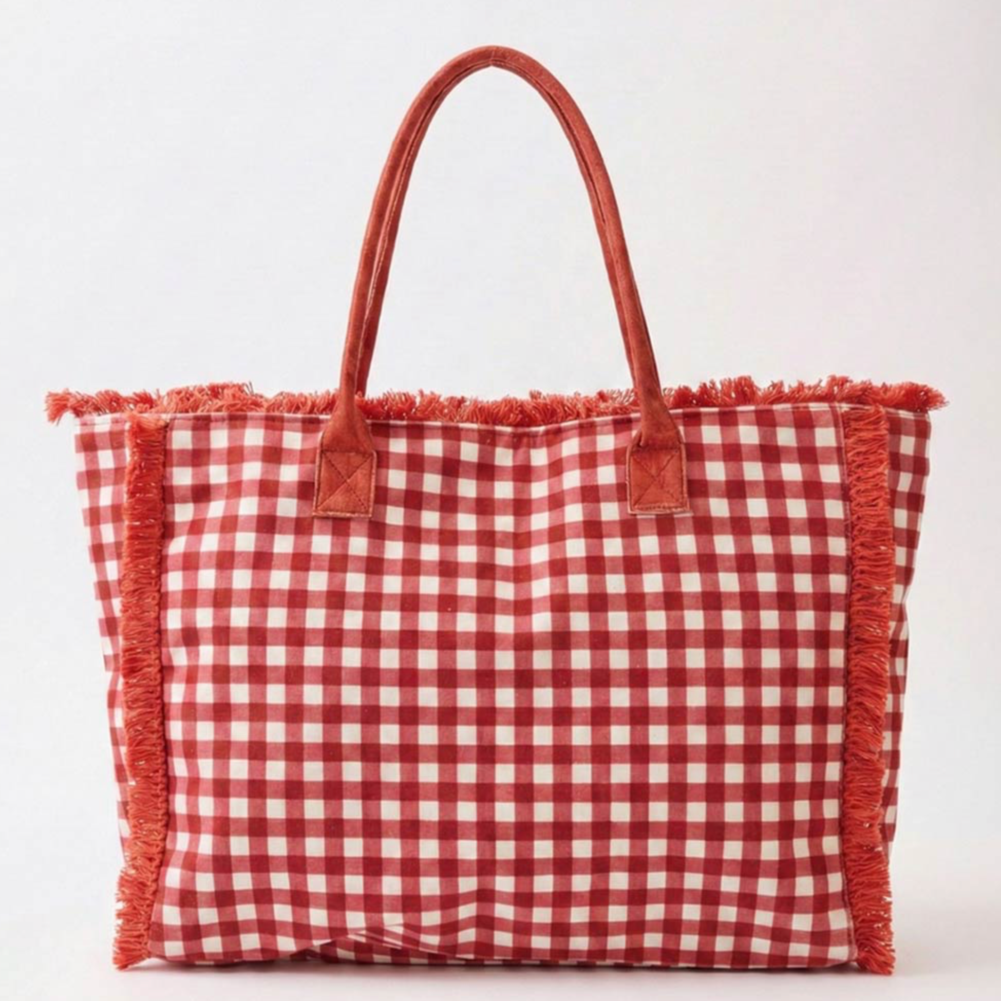 • Oversized tote bag featuring classic gingham pattern styling with bold fringe trim accents and comfortable shoulder straps. Designed with a spacious interior for beach days, travel, shopping, and everyday carry. A playful statement piece for seasonal boutique collections.