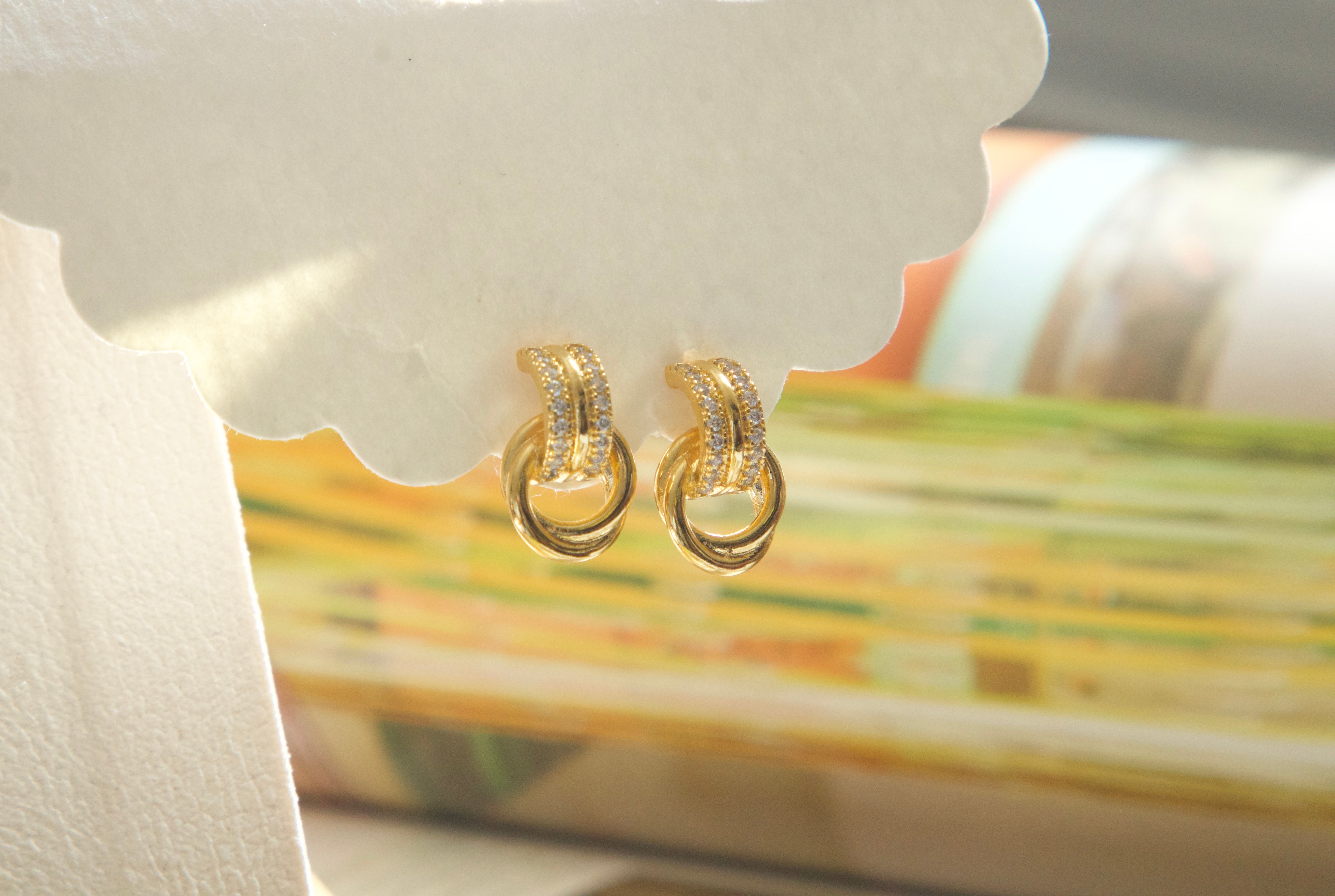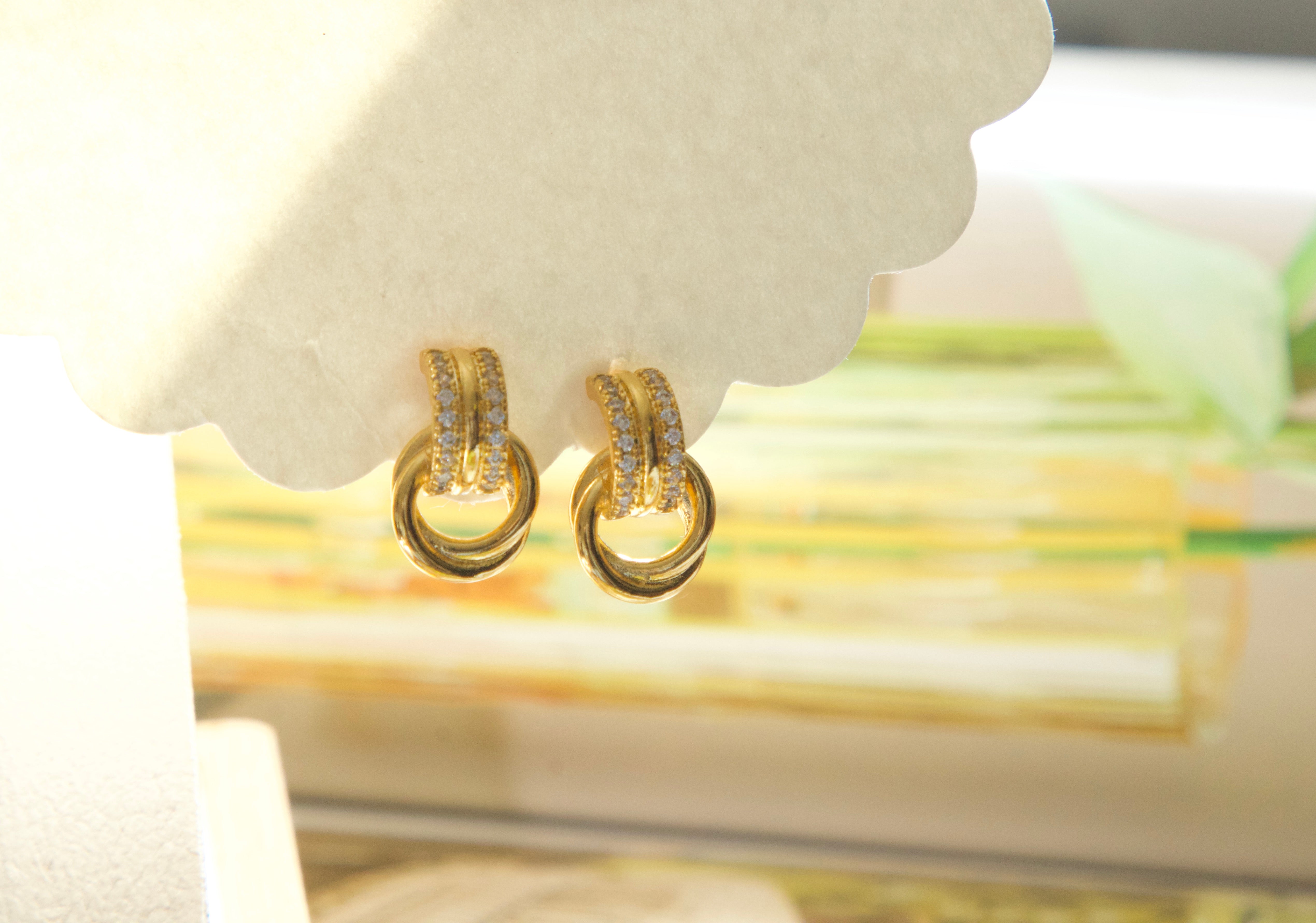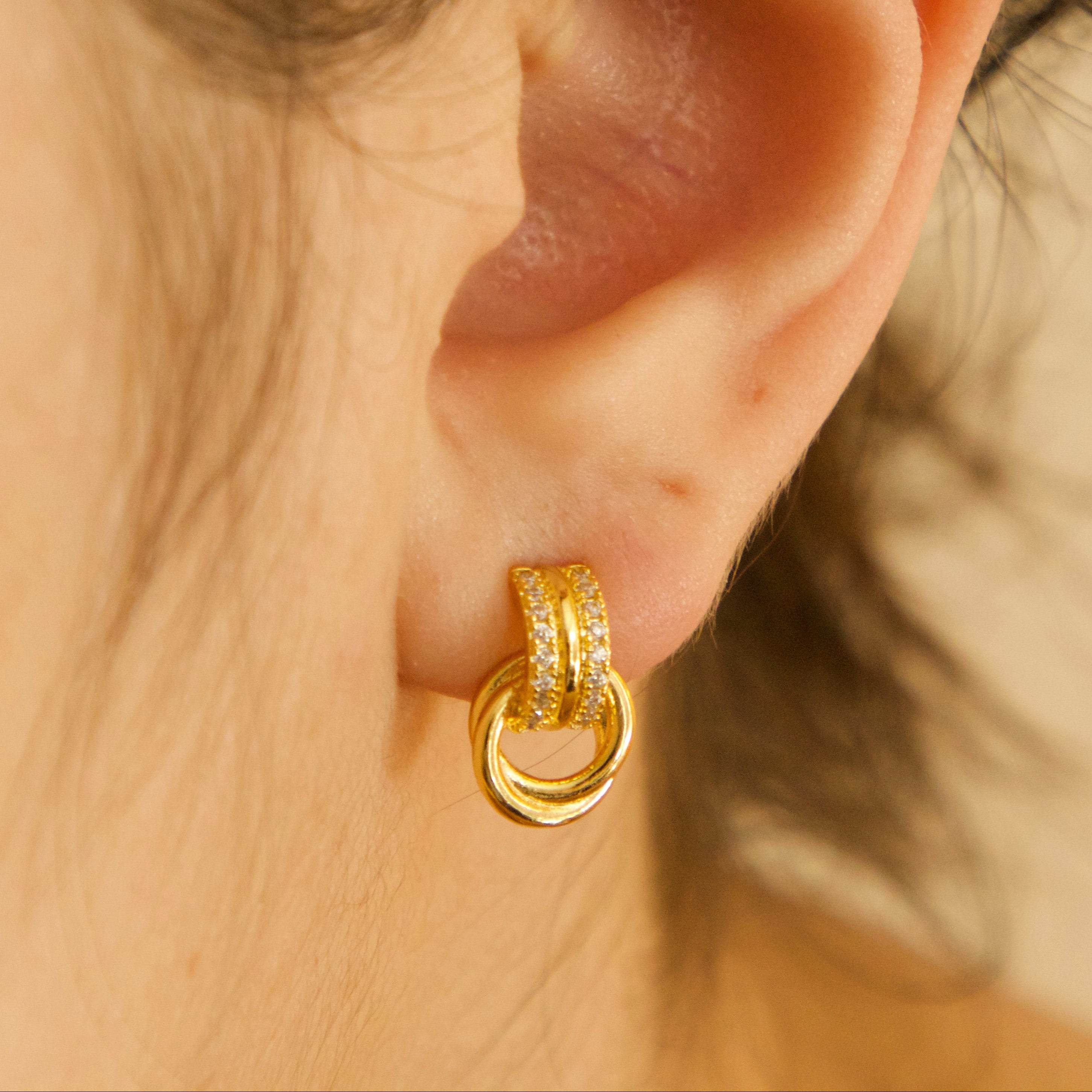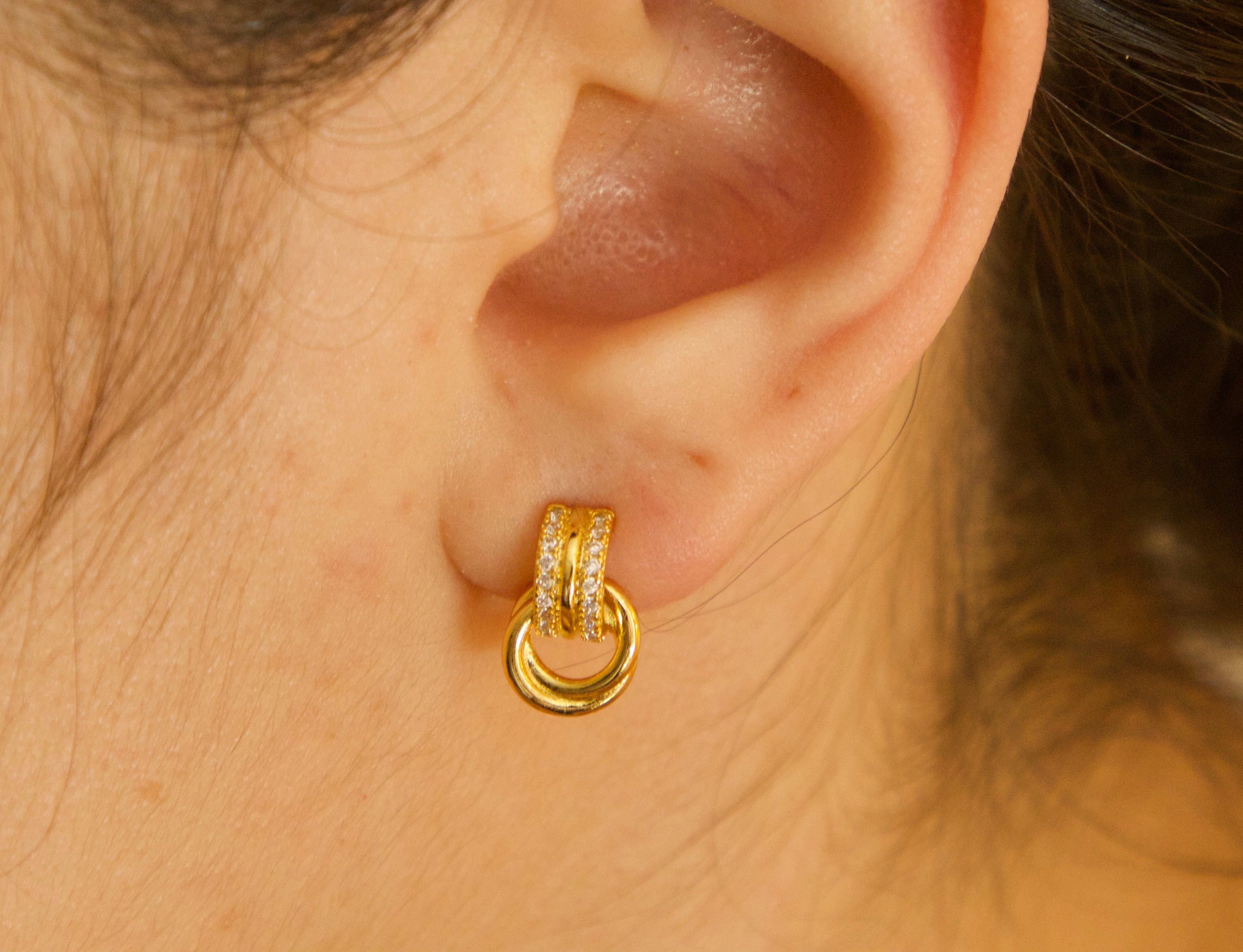 Designed with a pavé cubic zirconia huggie and a polished interlocking ring detail, these earrings create subtle movement while maintaining a compact, elegant silhouette. Lightweight and comfortable, they are ideal for sensitive ears and all-day styling.